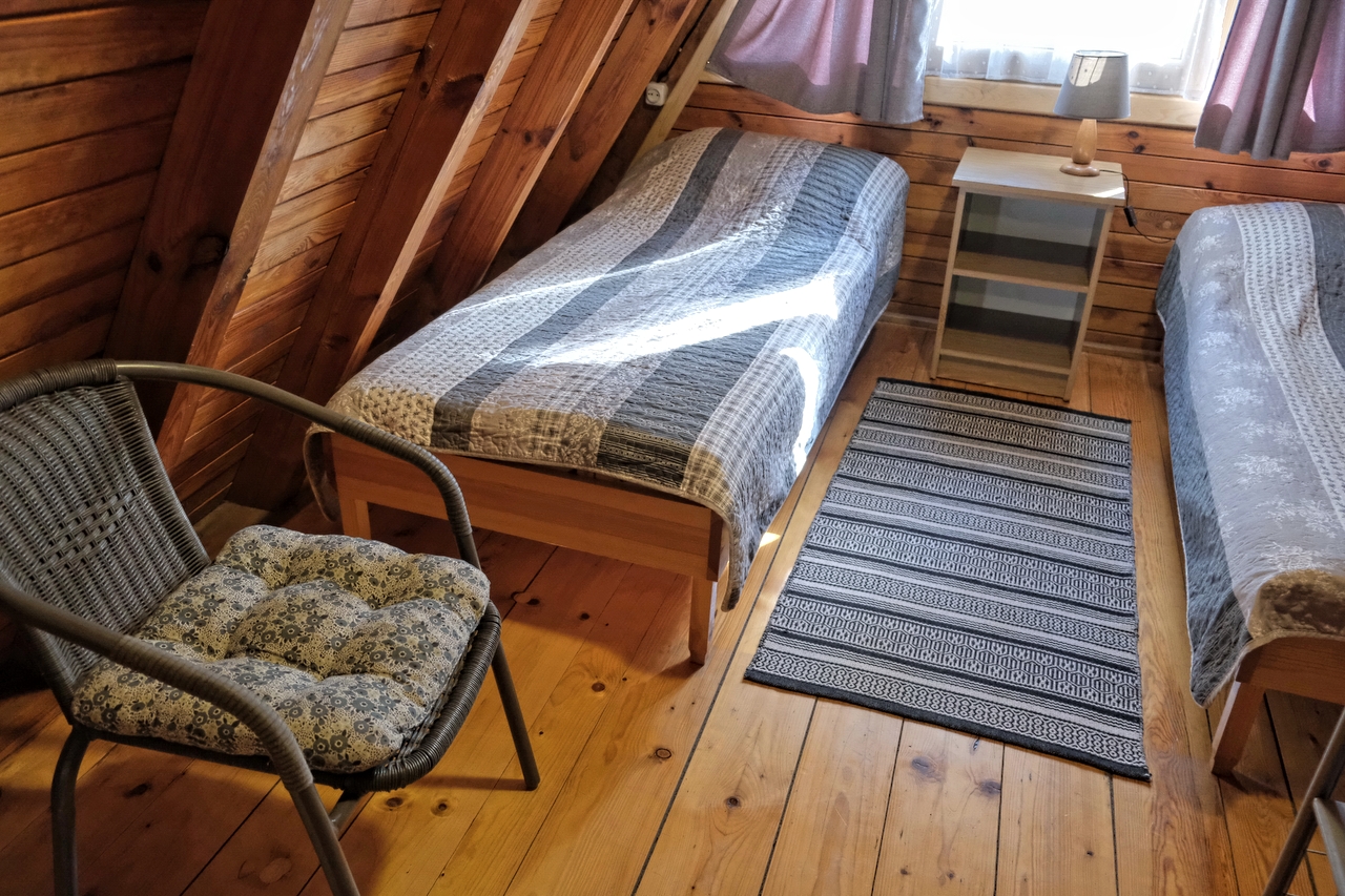 Poszycia podłóg stropu od spodu wykonane są z zachodzących na siebie deseczek. Wszystkie elementy lakierowane.