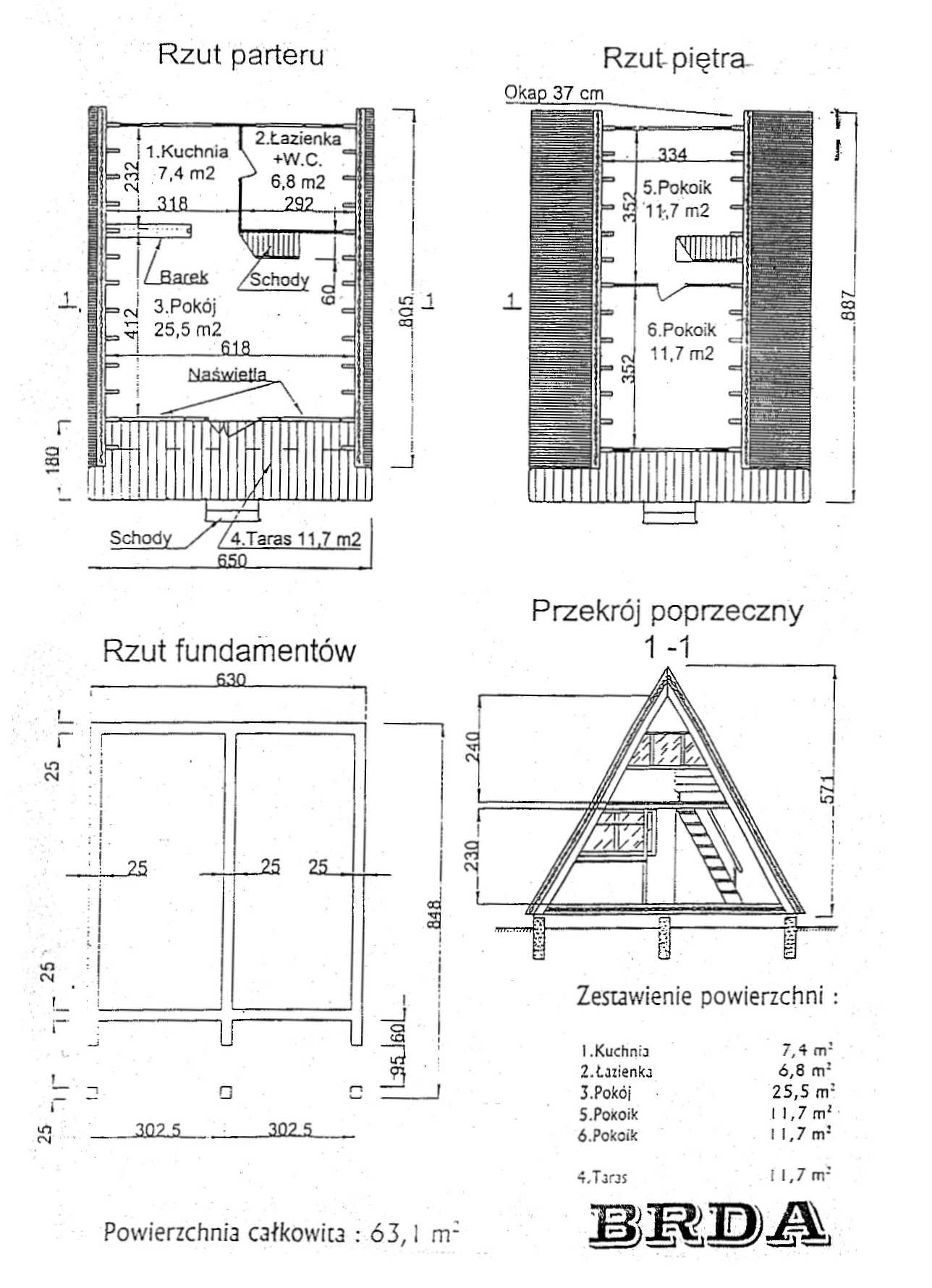 (fundamenty, wymiary, rozkład pokoi - wariant z małymi oknami i ławą fundamentową)